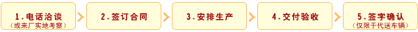 | 第一步:購車洽談:通過電話聯系或實地考察洽談車輛型號、價格和相關要求。 |