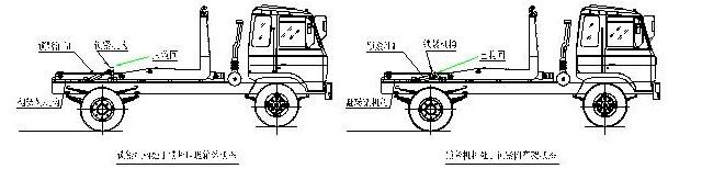 拉臂式垃圾車(chē)(車(chē)廂可卸式垃圾車(chē))使用說(shuō)明 一、概述 什么是勾臂垃圾車(chē)? 車(chē)廂可卸式垃圾車(chē)又稱拉臂式垃圾車(chē)(以下簡(jiǎn)稱垃圾車(chē))是用于城鎮(zhèn)袋裝、散裝生活垃圾物的收集、運(yùn)輸、卸料作業(yè)的專用車(chē)輛。 該車(chē)是由汽車(chē)底盤(pán)、拉臂主油缸、附車(chē)架、翻轉(zhuǎn)架、支撐腿(選裝)、鎖緊架、鎖緊油缸及多路換向閥等組成。翻轉(zhuǎn)架一端連在附車(chē)架上,其另一端設(shè)有活動(dòng)拉臂,中間安裝有鎖緊系統(tǒng);活動(dòng)臂油缸一端連在活動(dòng)臂上,另一端連接在附車(chē)架上;鎖緊機(jī)構(gòu)通過(guò)鎖緊油缸的動(dòng)作可以在箱體自卸時(shí)將附車(chē)架上的箱體與翻轉(zhuǎn)架及拉臂連為一體,在主油缸伸出時(shí)形成自卸角,也可以通過(guò)鎖緊油缸的收回把翻轉(zhuǎn)架與附車(chē)架鎖緊為一體,利用主油缸的收回或伸出使活動(dòng)拉臂將地下的垃圾箱拖拉至附車(chē)架上或從附車(chē)架上放回到地面。 該車(chē)可將地下垃圾箱內(nèi)的垃圾及垃圾箱一同拉至車(chē)上運(yùn)走同時(shí)可自卸,降低了工人的勞動(dòng)強(qiáng)度。該垃圾車(chē)的收運(yùn)方式是目前世界上廣泛采用的垃圾收運(yùn)方式,可以實(shí)現(xiàn)一車(chē)多箱,大大降低了配備成本和空間等等;其專用裝置的功能均以汽車(chē)發(fā)動(dòng)機(jī)為動(dòng)力,通過(guò)液壓機(jī)構(gòu)手動(dòng)或電控來(lái)實(shí)現(xiàn)。車(chē)輛的箱體采用優(yōu)質(zhì)炭鋼板全密封焊接結(jié)構(gòu),具有強(qiáng)度高、重量輕、不產(chǎn)生二次污染等優(yōu)點(diǎn)。 二、結(jié)構(gòu)簡(jiǎn)圖 三、操作步驟 在裝載垃圾前,空載運(yùn)轉(zhuǎn)達(dá)到6個(gè)標(biāo)準(zhǔn)氣壓時(shí),掛上取力器(駕駛室內(nèi)方向盤(pán)左下方),檢查各部件有無(wú)泄漏或異常后,再按照操作指示牌指示位置進(jìn)行操作;其具體操作步驟如下: 拉起垃圾箱體 步驟1.將鎖緊鉤操作手柄推至收回位置,鎖緊油缸收回,使鎖緊架收回并將翻轉(zhuǎn)架與附車(chē)架鎖緊固定;如圖: 步驟2.將拉臂操作手柄拉起到伸起位置,拉臂油缸伸出,活動(dòng)拉臂繞翻轉(zhuǎn)翻轉(zhuǎn)架前鉸鏈軸旋轉(zhuǎn),拉臂處于鉤箱位置,適當(dāng)調(diào)整拉臂鉤高度并與箱體彎鉤對(duì)準(zhǔn);如圖: