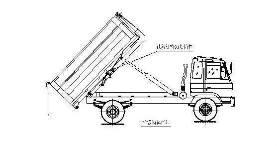 完成垃圾箱體的上車(chē)工作,松開(kāi)取力器,整車(chē)可以運(yùn)輸行駛。 步驟5. 在卸垃圾前,整車(chē)運(yùn)轉(zhuǎn)達(dá)到6個(gè)標(biāo)準(zhǔn)氣壓時(shí)掛上取力器,打開(kāi)垃圾箱后門(mén)鎖緊裝置,在前級(jí)二聯(lián)多路閥處,首先確定鎖緊架鎖緊垃圾箱體(拉起鎖緊鉤操作手柄至鎖緊位置),然后拉起拉臂操作手柄至伸出位置,垃圾箱體備傾斜舉起垃圾卸出;如圖: